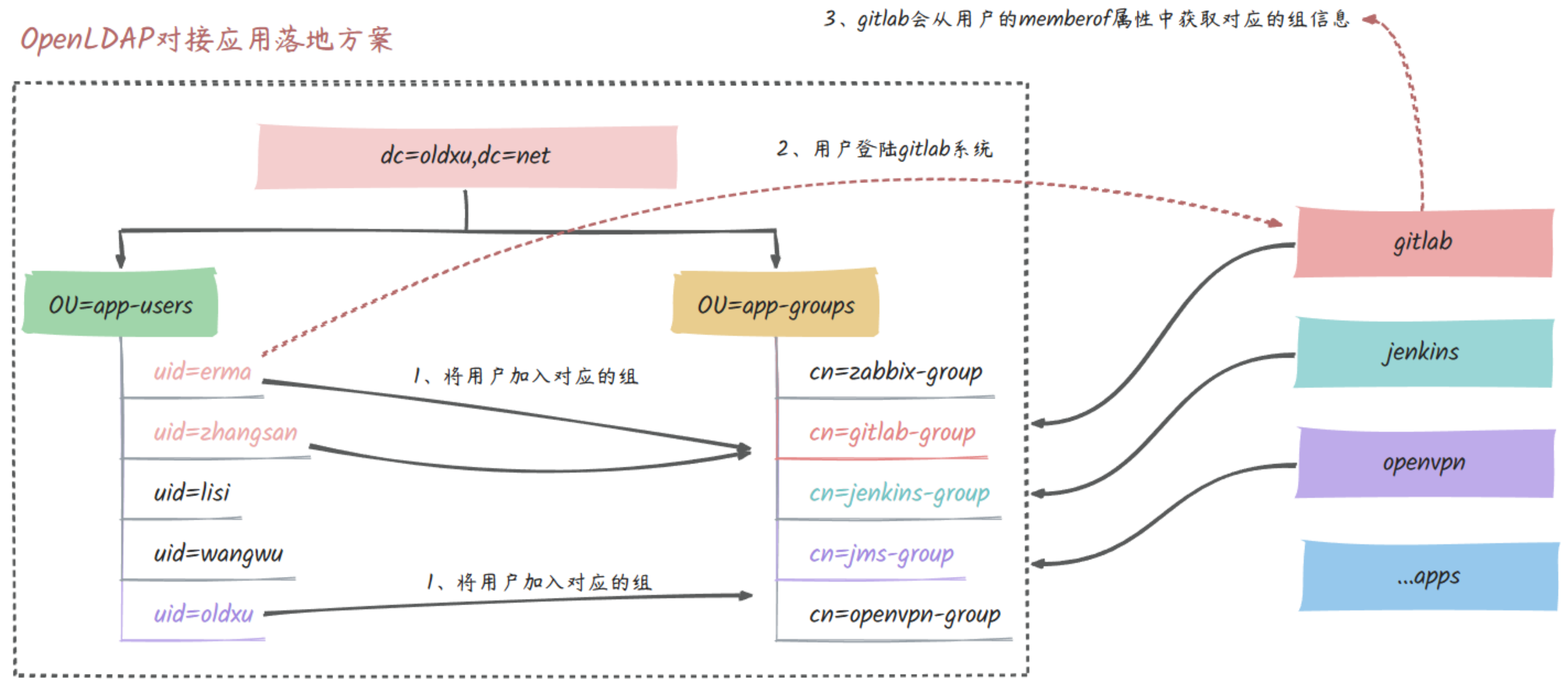 通常我们会在 LDAP ⽬录中为每个应⽤创建对应的组,然后在这些组下⾯添加对应的⽤户。当⽤户加⼊了某个组之后,就可以访问对应的系统。 问题是,如果每个应⽤都需要创建对应的组,那么每个组中就会出现重复添加相同的⽤户。例如,我们希望 zhangsan 既可以访问 GitLab 也可以访问 Jenkins,那么我们需 要在 GitLab 和 Jenkins 各⾃对应的组中都创建 zhangsan ⽤户,这就违背了我们希望通过 LDAP 实现单⼀⽤户登录多个系统的初衷。为了解决如上的问题,我们会可以将所有⽤户都放置在同⼀个 OU(组织单元)中,这样每个⽤户都可以访问所有的系统,也就实现了单⼀⽤户登陆多个系统。但,这样⼜会带来⼀个新的问题,例如,有 10 个⽤户和 3 个系统的场景下,即便我们只授权了 3 个⽤户访问这些系统,但在实际测试时发现,其他 7 个⽤户也能正常访问这些系统。这显然与实际的⽣产需求不符。