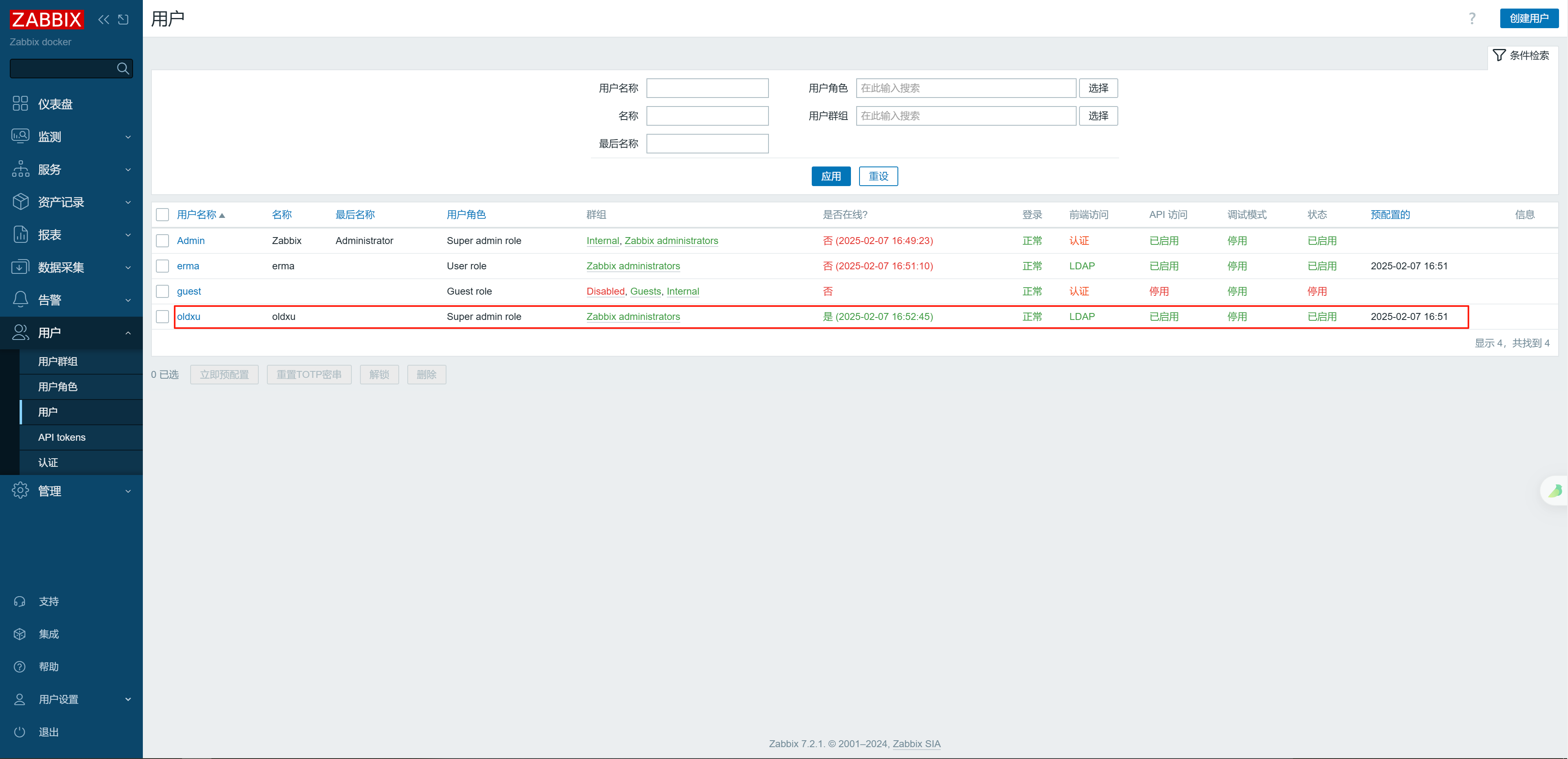 1、在 app-groups 下创建 zabbix-group 的组,⽤来存储普通⽤户,并将 erma 和 zhangsan 加⼊组中;ldapadd -x -D cn=admin,dc=oldxu,dc=net -w 123456 <<EOF
