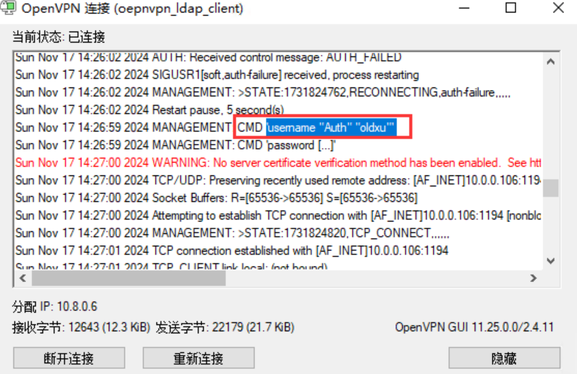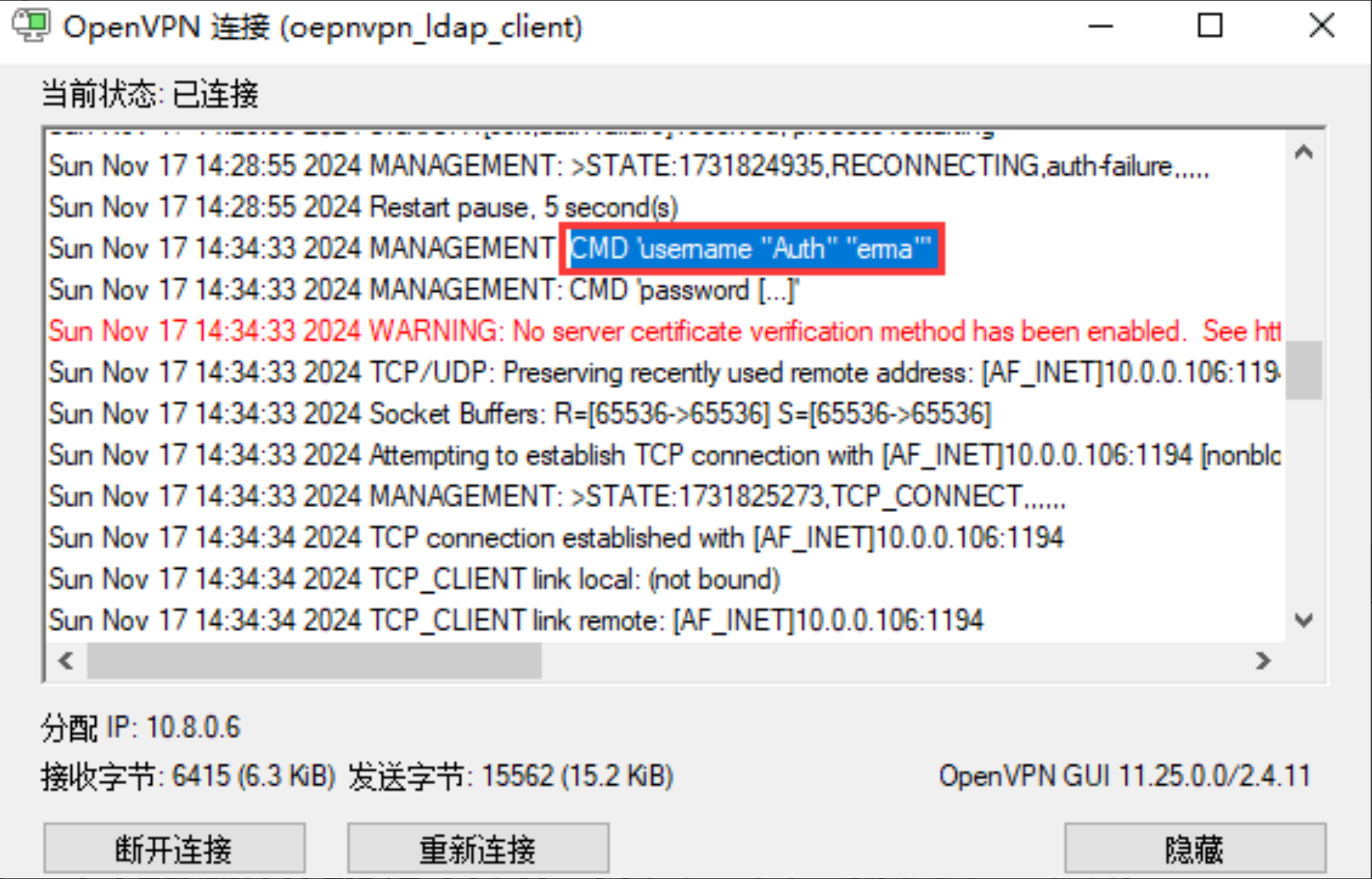 2、使⽤ openvpn-group 组成员连接,能够成功链接VPN