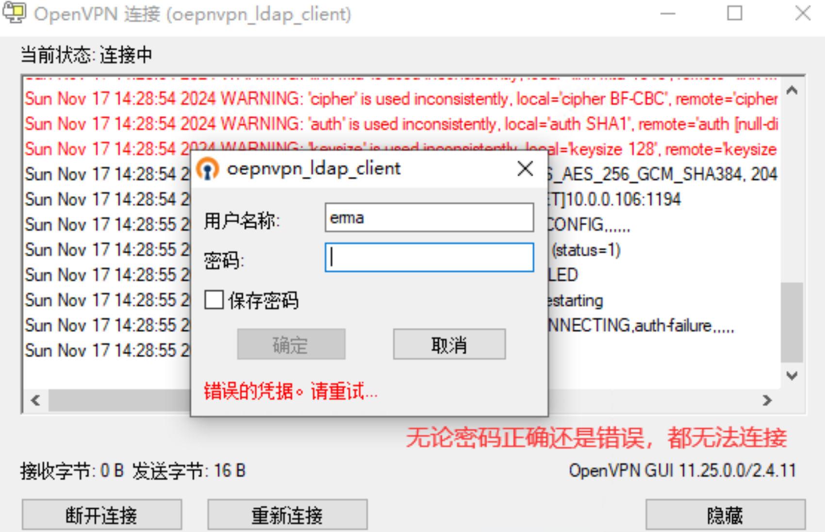 3、使⽤⾮openvpn-group组成员测试,会发现连接失败
