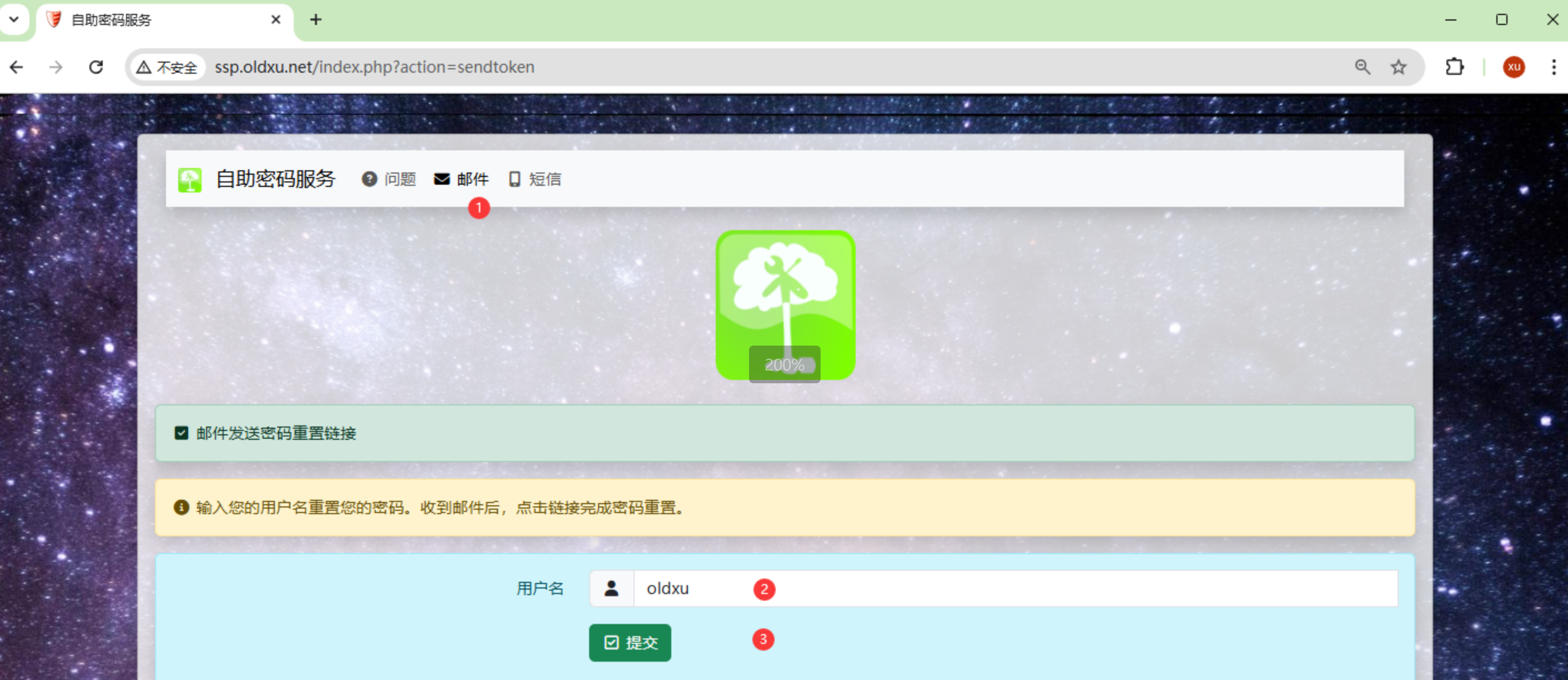 1、 点击邮箱,输⼊需要修改密码的⽤户名,系统会根据⽤户在 LDAP 中的 mail 属性查询其绑定的邮箱地址,并将密码重置的链接发送到该邮箱,如果邮箱不正确则⽆法收到重置密码的邮件。