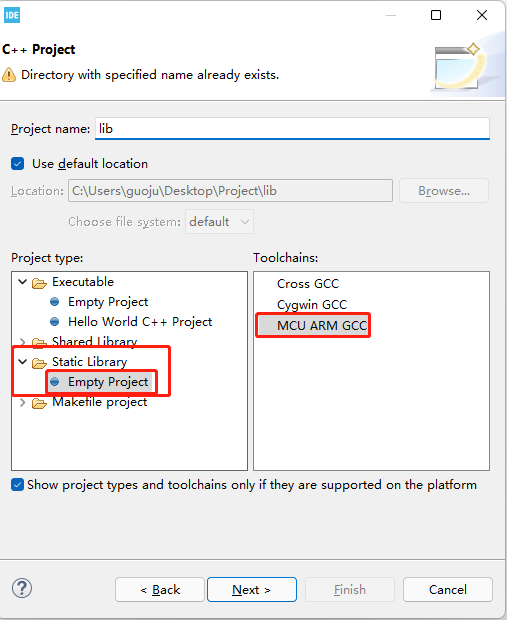 3. 输入工程名,选择静态库,编译选择MCU ARM GCC