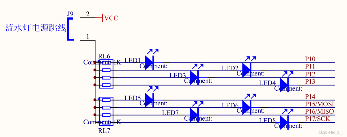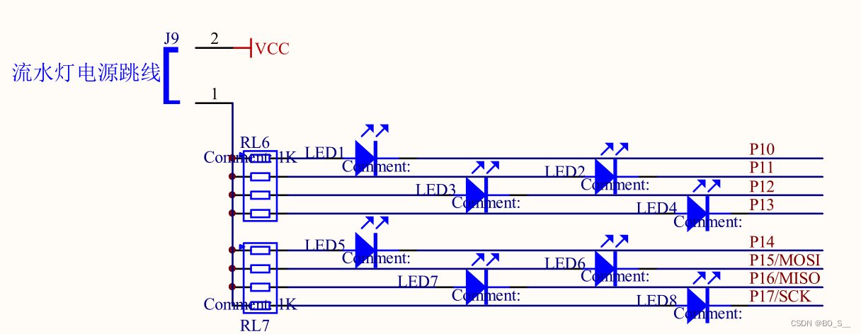 根据原理图,只需要控制单片机P1口的某些位=0就可以让对应的LED亮,下面进行程序部分。