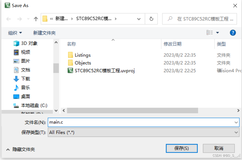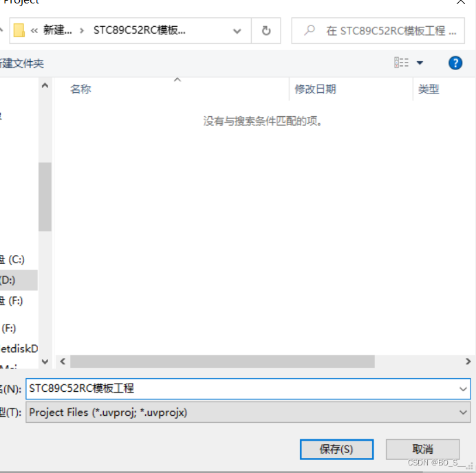 3.在弹出的文件保存框中进入到自己刚才创建的文件夹的位置,给模板文件起一个有意义的名字,比如STC89C52RC模板工程,再点击保存