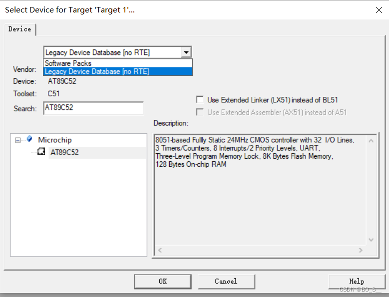 4.在左上方选择框中选择Legacy Device Database [no RTE],在下方的输入框中输入AT89C52,因为STC是国产的,keil没有收录,AT89C52与STC89C52内核一样,只是不同公司生产的芯片,而STC89C52和STC89C52RC区别不大,没有别的选择就选这个就行了,输入完成后点击AT89C52,再点击OK进行下一步操作