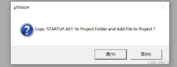 5.这个点击“否”就行了,意思是问你要不要把"STARTUP.A51"添加到工程中,我们不需要看这个