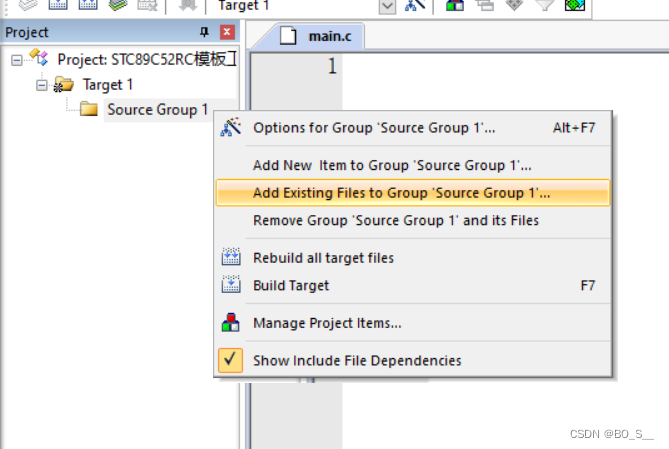 7.把左侧边栏的target1展开,在Source Group 1上右键,选择Add Existing Files to Group 'Source Group 1'.