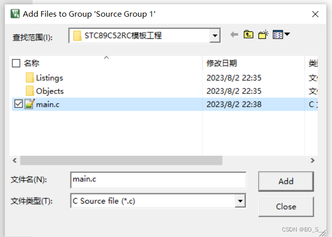 然后在弹窗的文件浏览窗口中选中刚才创建的main.c,点击Add,再点击Close