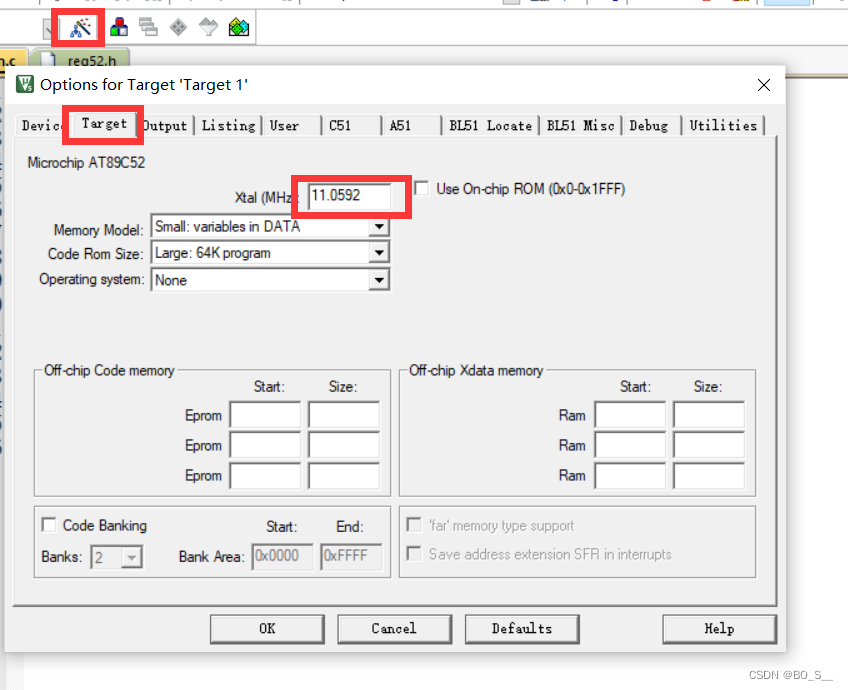 8.点击上方的魔术棒,在Target一栏把晶振频率改成自己开发板上的晶振频率,我的是11.0592MHz