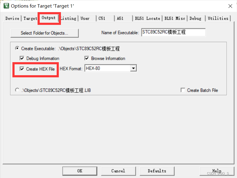 然后再点击Output选项,勾选Create HEX File,这样编译就会产生一个hex文件,用于程序烧录,其余选项保持默认不要动就行了
