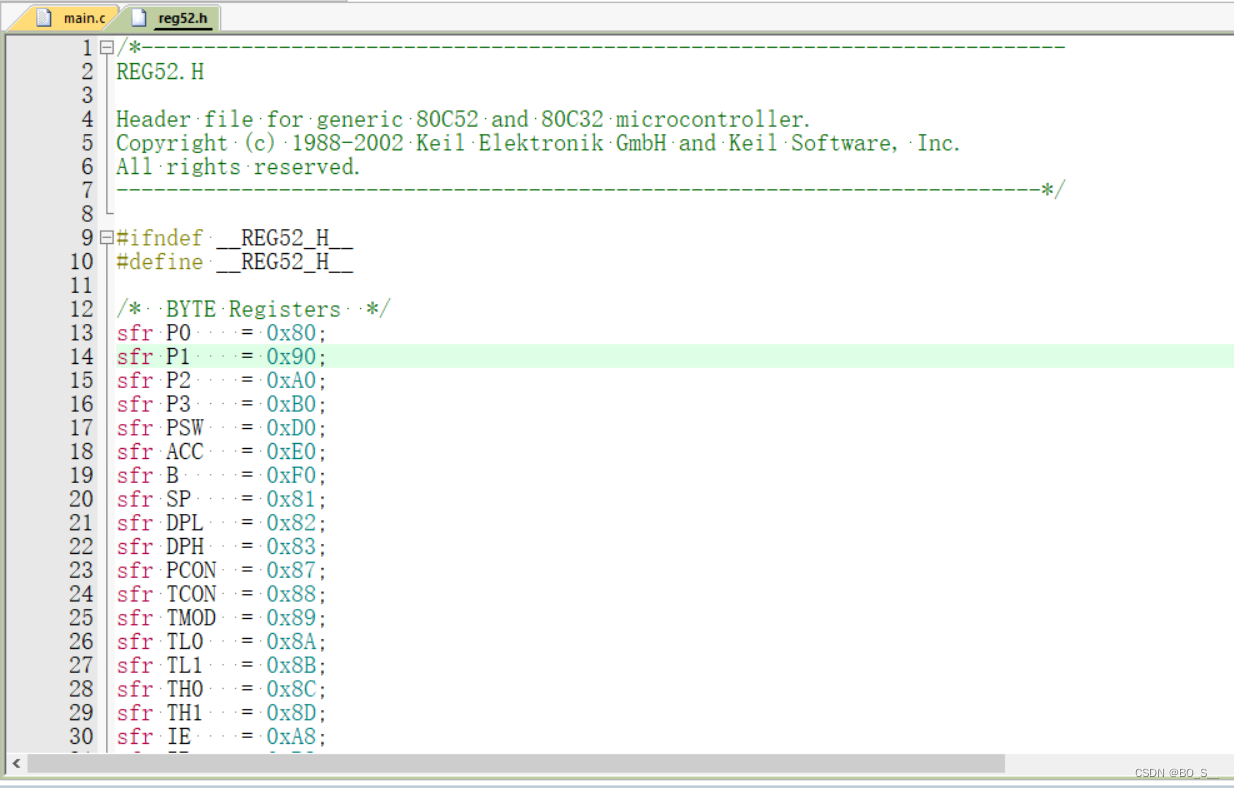 打开之后是这样的,可以看到里面定义可很多寄存器地址,比如sfr P0 = 0x80; 这行代码定义了一个特殊功能寄存器(Special Function Register, SFR),用于访问 8051/8052 系列单片机的 P0 端口。
