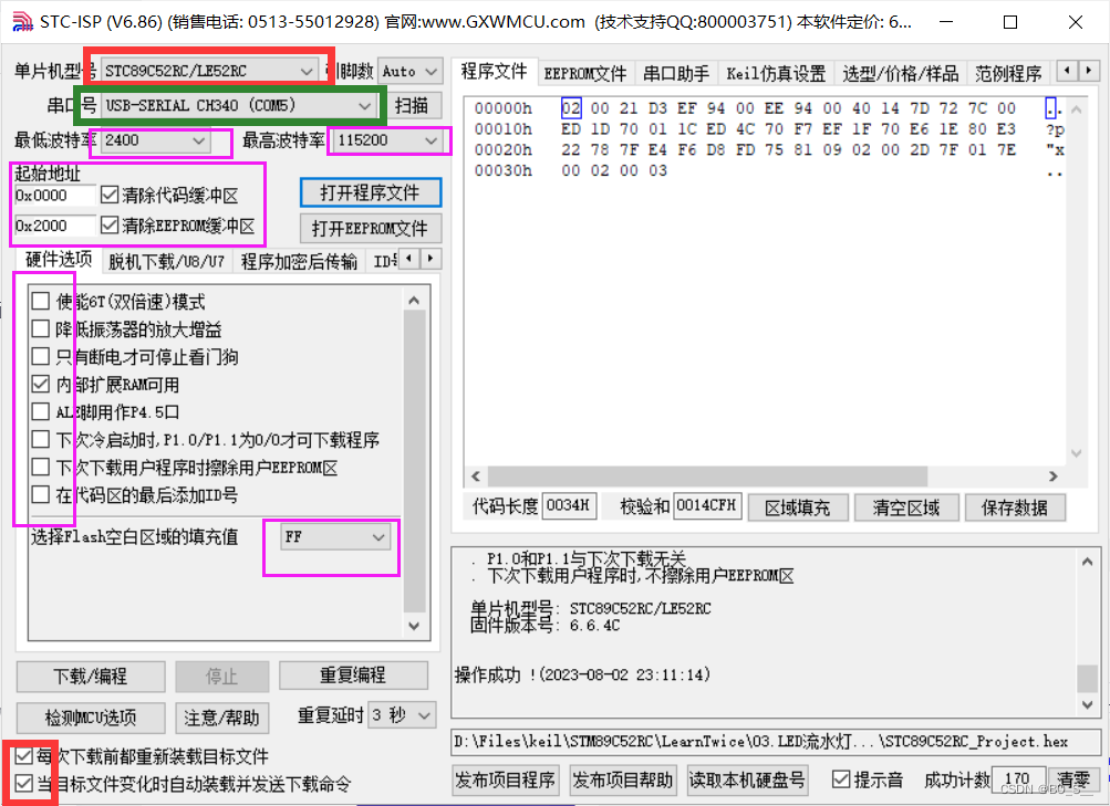 打开软件后按照图片配置。真正需要自己配置的其实只有红色框,在第一个红色框中选择STC89C52RC芯片(用什么芯片就选什么),下面的红色框两个都要勾选,这样我们每次修改完程序编译后程序会自动下载,省去了每次编译完还要打开下载软件去下载程序的麻烦。
