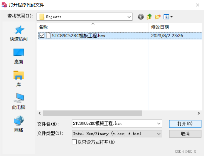 配置完成后就可以下载程序到单片机了,点击“打开程序文件”,在弹出的文件浏览器中选择到刚才的项目文件夹下,注意生成的hex文件在项目文件夹下的Object文件夹里面,选中它点击打开