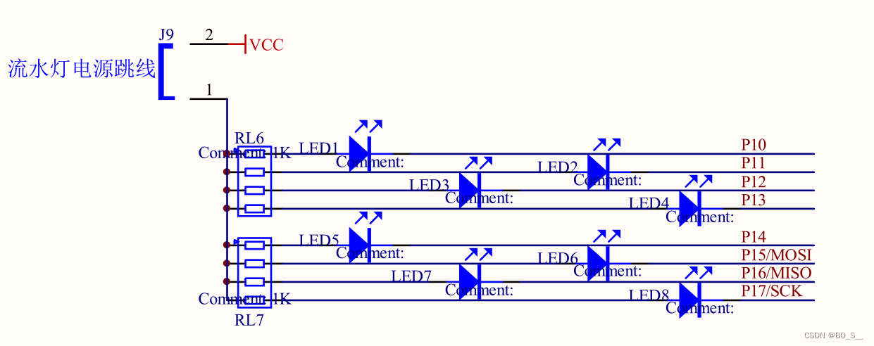 根据原理图,如果我想让所有LED都点亮,只需要设置P1的所有8个引脚都为低电平,在程序中可以直接写