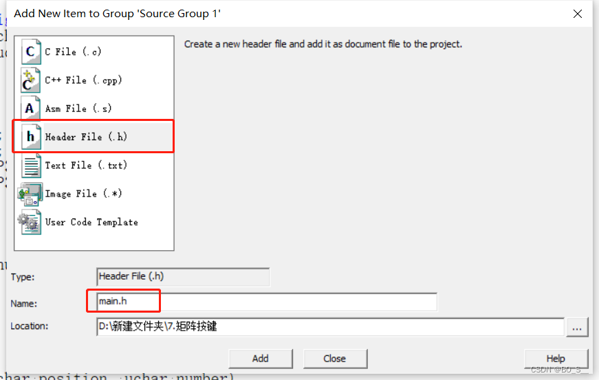 选择.h文件,名字为main.h,Add,这样在左侧边栏就会有一个main.h文件,里面可以放一些函数的声明,数组,宏定义等,以此来简化main.c函数,在我以后的代码中,我将同时给出我的main.h和main.c中的代码。可以直接在工程模板中创建一个,这样以后复制的工程模板改名文件里面都有main.h了,也可以在工程模板中直接写入