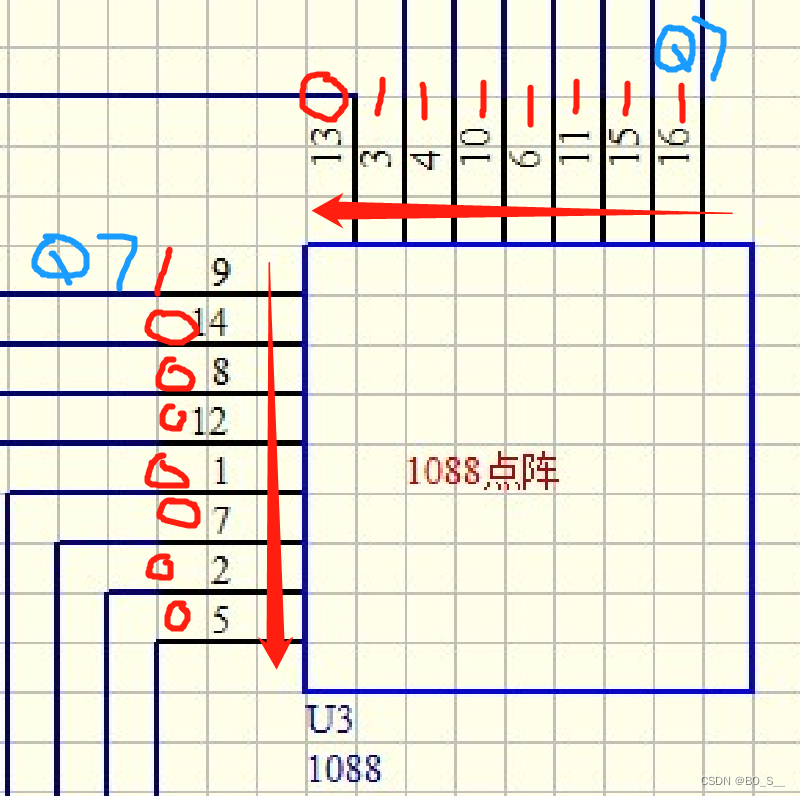 点亮指定位置的LED就可以显示出想要的图案,比如给⑨1,给⑬0,其余的行都为0,其余的列都为1,那么左上角的就会点亮。