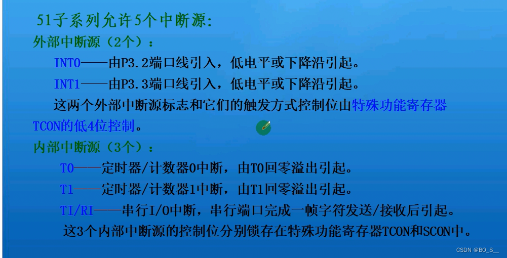 注:我在数据手册看到STC89C52RC有8个中断源,分别是外部中断03,定时器中断02, 串口中断,但是我查找网上资料发现大多数都说51单片机有5个中断,正如视频所讲那样