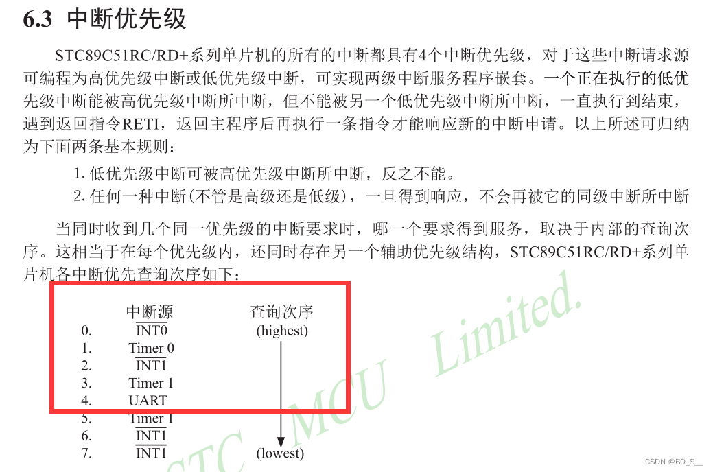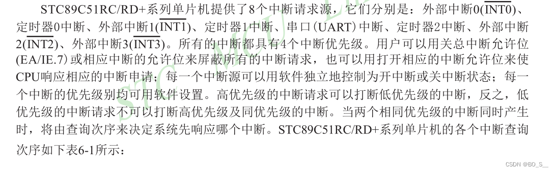 - 也就是说单片机复位后,如果不设置优先级,那么所有中断优先级都是相同的,即优先级0(最低优先级),根据优先级相同的情况下,使用 4.4.1 同级查询次序 的内容,有一个默认查询次序,相当于一个默认优先级,所以在下面的代码中没有配置优先级这一项。