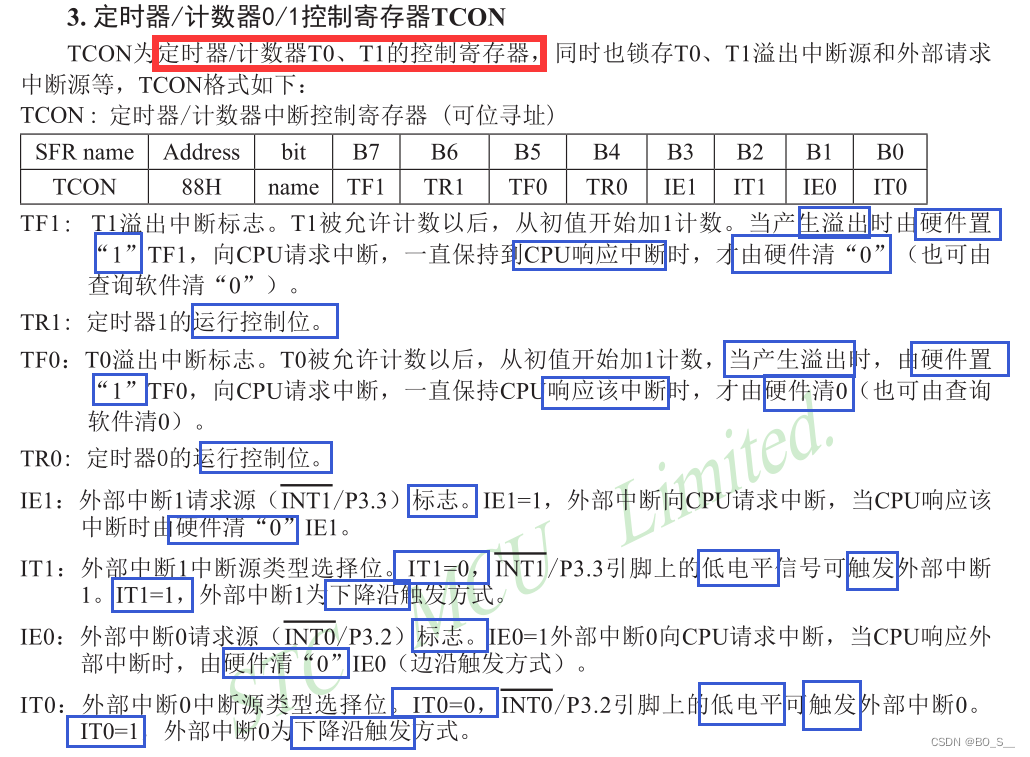 - 设置触发方式。是低电平触发还是下降沿触发(TCON寄存器)