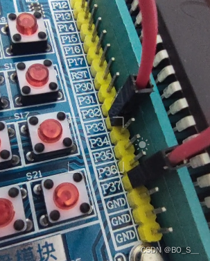 把P33和P37通过一根杜邦线连接起来。P33是外部中断1的中断产生引脚,P37是我们准备用来产生一个下降沿,从而使外部中断1触发。连接如图: