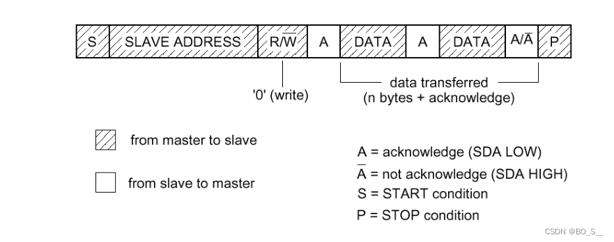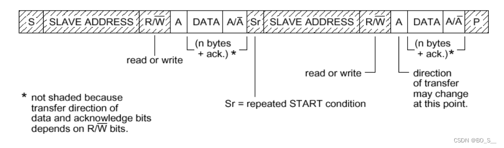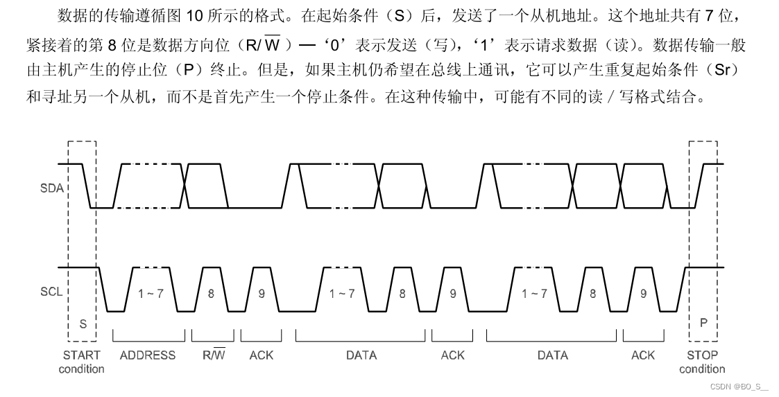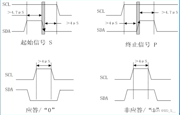 S(起始条件)/P(停止条件):起始条件表示I2C通信即将开始,由主设备发出;停止条件表示I2C通信结束,由主设备发出。起始条件和停止条件用于定义I2C通信的开始和结束点。