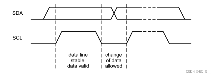 在IIC传输数据的过程中,在传输数据时,SDA只能在SCL = 0时改变,在SCL = 1时SDA必须保持稳定。