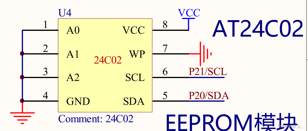 根据原理图可见,A2,A1,A0全部都接地,是0,那么板载的AT24C02地址就是b1010 000,所以在起始信号之后,要发送A0(表示写数据)或A1(表示读数据)进行寻址