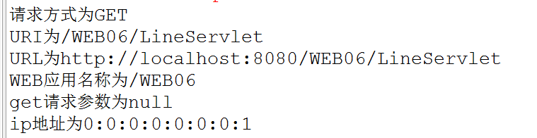 package com.oracle.demo01; import java.io.IOException; import javax.servlet.ServletException; import javax.servlet.http.HttpServlet; import javax.servlet.http.HttpServletRequest; import javax.servlet.http.HttpServletResponse; public class LineServlet extends HttpServlet { public void doGet(HttpServletRequest request, HttpServletResponse response) throws ServletException, IOException { //获取请求方式 System.out.println("请求方式为"+request.getMethod()); //获取请求URI System.out.println("URI为"+request.getRequestURI()); //获取请求URL System.out.println("URL为"+request.getRequestURL()); //获取WEB应用名称 System.out.println("WEB应用名称为"+request.getContextPath()); //获取get请求后URL后的字符串 System.out.println("get请求参数为"+request.getQueryString()); //获取客户端的ip地址 System.out.println("ip地址为"+request.getRemoteAddr()); } public void doPost(HttpServletRequest request, HttpServletResponse response) throws ServletException, IOException { doGet(request, response); } }