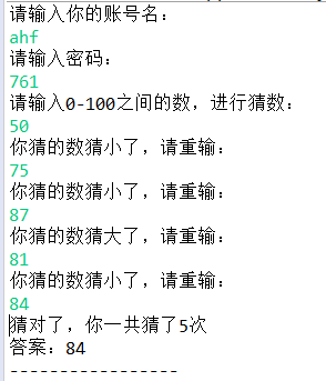 猜数字游戏测试主要是针对用户的操作,从测试结果中可以看出该模块的所有功能均能正常实现,且测试结果与预期结果一致。