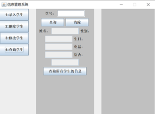 此学生管理系统,我们需要做到简答的对学生的学号,姓名,性别,宿舍,生日,电话等基本信息的修改,清除等基本操作并于数据连接,形成一定的虚拟表格,以便使用者方便快速的阅读,并通过GUI模板形式做出其录入界面。