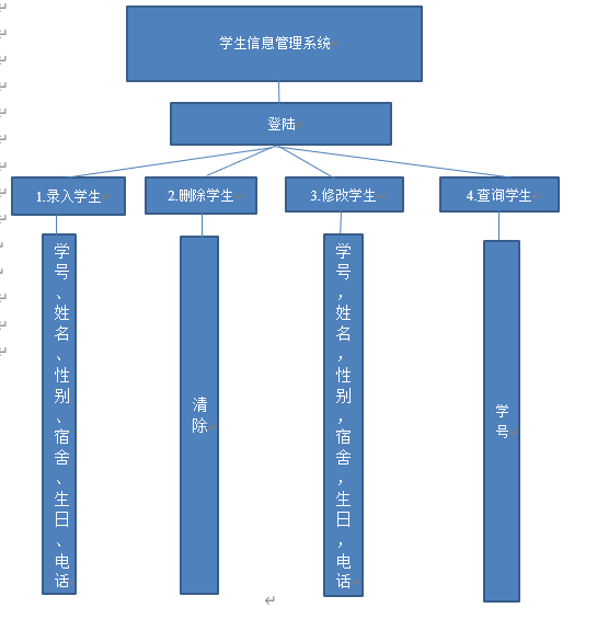 本系统是学生信息管理系统,首先由管理员输入账号密码登录系统,管理员登录后对学生学号,姓名,性别,生日,电话,宿舍信息,进行增加、修改、查询、删除的操作。