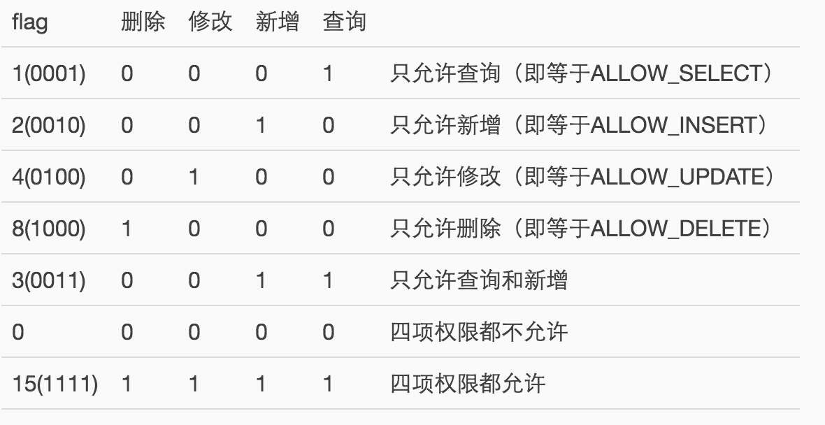 ALLOW_INSERT = 1 << 1 转成二进制就是0010,二进制第二位表示Insert权限。