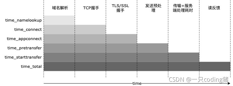 所以time_connect的含义是TCP建立连接时间,而实际上,它包含了域名解析的时间,所以如果仅希望获得TCP的三次握手耗时,应当用time_connect - time_namelookup,后面的参数也是一样。如果希望获得数据往返传输和服务器处理的耗时,就需要用time_starttransfer - time_pretransfer。