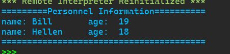1 # 使用f-string方式输出数据并控制格式 2 3 name1,age1 = 'Bill',19 4 name2,age2 = 'Hellen',18 5 title = 'Personnel Information' 6 7 print(f'{title:=^40}')# 输出title的值,=^40指定输出宽度占40列,居中对齐,用=填充空白 8 print(f'name: {name1:10} age: {age1:3}') # 10和3分别指定数据项输出宽度 9 print(f'name: {name2:10} age: {age2:3}') 10 print(40*'=')