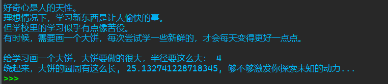 1 # 神奇的pi, 与大饼 2 3 import math 4 5 text = ''' 6 好奇心是人的天性。 7 理想情况下,学习新东西是让人愉快的事。 8 但学校里的学习似乎有点像苦役。 9 有时候,需要画一个大饼,每次尝试学一些新鲜的,才会每天变得更好一点点。 10 ''' 11 print(text) 12 13 r = float(input('给学习画一个大饼,大饼要做的很大,半径要这么大: ')) 14 15 circle = 2*math.pi*r 16 17 print(f'绕起来,大饼的圆周有这么长, {circle}, 够不够激发你探索未知的动力...')
