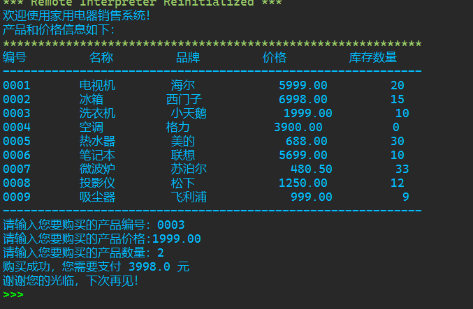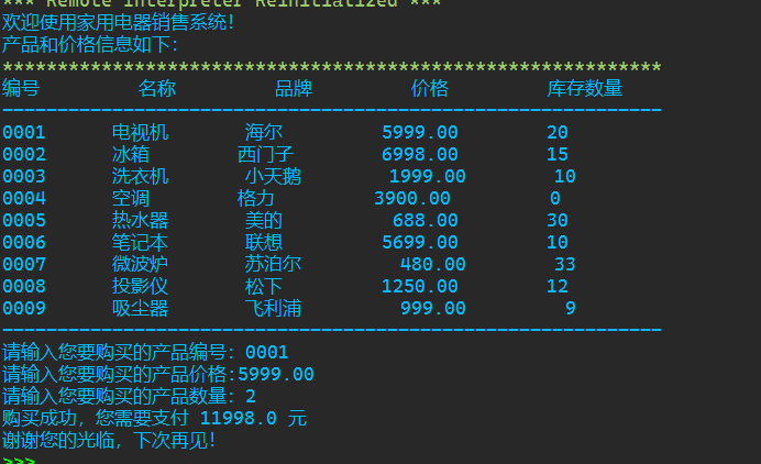 1 """ 2 家用电器销售系统 3 v1.0 4 """ 5 6 #欢迎信息 7 print('欢迎使用家用电器销售系统!') 8 9 #产品信息列表 10 print('产品和价格信息如下:') 11 print('*'*60) 12 print('%-10s'%'编号', '%-10s'%'名称', '%-10s'%'品牌', '%-10s'%'价格', '%-10s'%'库存数量') 13 print('-'*60) 14 print(f"{'0001':10s}{'电视机':10s}{'海尔':10s}{5999:8.2f}{20:10}") 15 print(f"{'0002':10s}{'冰箱':10s}{'西门子':10s}{6998:8.2f}{15:10}") 16 print(f"{'0003':10s}{'洗衣机':10s}{'小天鹅':10s}{1999:8.2f}{10:10}") 17 print(f"{'0004':10s}{'空调':10s}{'格力':10s}{3900:8.2f}{0:10}") 18 print(f"{'0005':10s}{'热水器':10s}{'美的':10s}{688:8.2f}{30:10}") 19 print(f"{'0006':10s}{'笔记本':10s}{'联想':10s}{5699:8.2f}{10:10}") 20 print(f"{'0007':10s}{'微波炉':10s}{'苏泊尔':10s}{480:8.2f}{33:10}") 21 print(f"{'0008':10s}{'投影仪':10s}{'松下':10s}{1250:8.2f}{12:10}") 22 print(f"{'0009':10s}{'吸尘器':10s}{'飞利浦':10s}{999:8.2f}{9:10}") 23 print('-'*60) 24 25 #用户输入信息 26 product_id = input('请输入您要购买的产品编号:') 27 price = float(input('请输入您要购买的产品价格:')) 28 count = int(input('请输入您要购买的产品数量:')) 29 #计算金额 30 print('购买成功,您需要支付',price*count,'元') 31 #退出系统 32 print('谢谢您的光临,下次再见!')