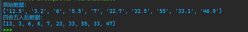 1 with open('data6.csv','r',encoding='gbk') as f: 2 data1 = f.read().split('\n') 3 del data1[0] 4 print('原始数据:') 5 print(data1) 6 7 for i in range(len(data1)): 8 data1[i] = float(data1[i]) 9 data2 = [] 10 for i in range(len(data1)): 11 data2.append(int(data1[i]+0.5)) 12 print('四舍五入后数据:') 13 print(data2) 14 15 title = ['原始数据','四舍五入后数据'] 16 info = [] 17 for i in range(len(data1)): 18 info.append([str(data1[i]),str(data2[i])]) 19 with open('data6_processed.csv','w',encoding='gbk') as f: 20 f.write(','.join(title)+'\n') 21 for item in info: 22 f.write(','.join(item)+'\n')