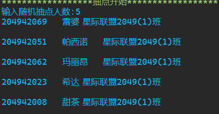 1 with open('data10_stu.txt','r',encoding='utf-8') as f: 2 data = f.readlines() 3 print('{:*^40}'.format('抽点开始')) 4 n = int(input('输入随机抽点人数:')) 5 import random 6 x = [] 7 while len(set(x)) < n: 8 x.append(random.randint(0, len(data)-1)) 9 10 lst = [] 11 for i in x: 12 print(data[i],end = '\n') 13 lst.append(data[i]) 14 15 import datetime 16 t = datetime.datetime.now() 17 y = t.strftime('%Y%m%d') 18 with open(f'{y}.txt','w',encoding='utf-8') as f: 19 f.writelines(lst)