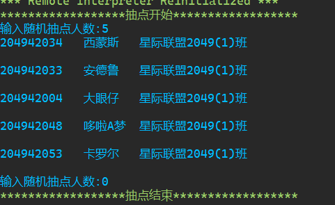 1 with open('data10_stu.txt','r',encoding='utf-8') as f: 2 data = f.readlines() 3 print('{:*^40}'.format('抽点开始')) 4 lst1 = [] 5 x = [] 6 while True: 7 n = int(input('输入随机抽点人数:')) 8 if n == 0: 9 print('{:*^40}'.format('抽点结束')) 10 break 11 else: 12 x = [] 13 import random 14 while len(x) < n: 15 t = random.randint(0, len(data)-1) 16 if (str(t) not in lst1) and (str(t) not in x): 17 x.append(t) 18 lst1.append(t) 19 20 lst = [] 21 for i in x: 22 print(data[i],end = '\n') 23 lst.append(data[i]) 24 25 import datetime 26 t = datetime.datetime.now() 27 y = t.strftime('%Y%m%d') 28 with open(f'{y}.txt','w',encoding='utf-8') as f: 29 f.writelines(lst)