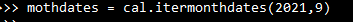 返回一个迭代器,迭代器的内容为 year 年 month 月(1-12)的日期。这个迭代器返回当月的所有日期 (