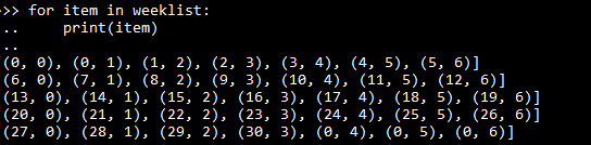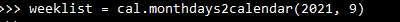 monthdays2calendar(year, month)返回一个表示指定年月的周列表。周列表由七个代表日期的数字和代表周几的数字组成的二元元组。