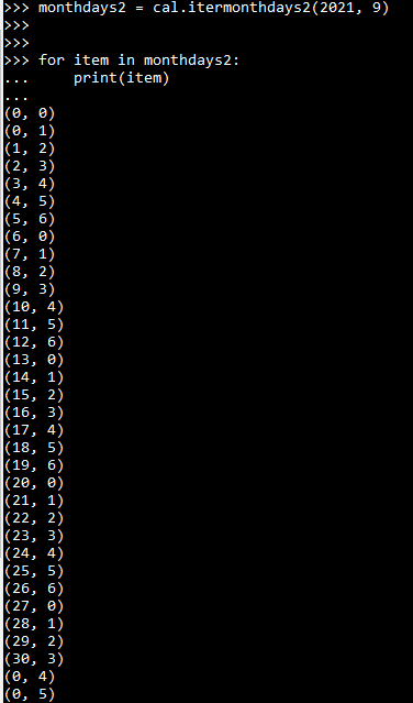itermonthdays2(year, month)返回一个迭代器,迭代器的内容与