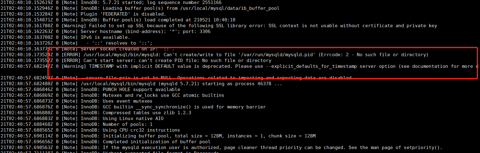 Starting MySQL.. ERROR! The server quit without updating PID file (/var/run/mysqld/mysqld.pid) 这个问题意思是,服务起来了,但是不能往pid文件里写数据, 然后后面还有一句话的意思是,不能是没有pid文件,这不就冲突了吗,然后就去看了mysql的日志文件,日志文件中有说这个问题: