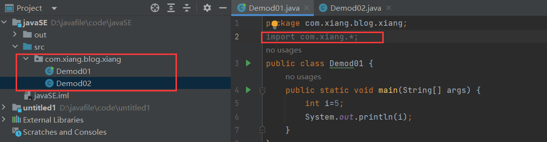 要想将左边的所有的类进行导入到右边代码区,则需要在代码区红框位置import com.xiang.blog.xiang.*;