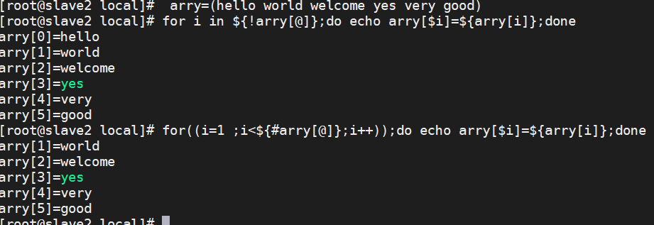 arry=(hello world welcome yes very good) for i in ${!arry[@]};do echo arry[$i]=${arry[i]};done for((i=1 ;i<${#arry[@]};i++));do echo arry[$i]=${arry[i]};done