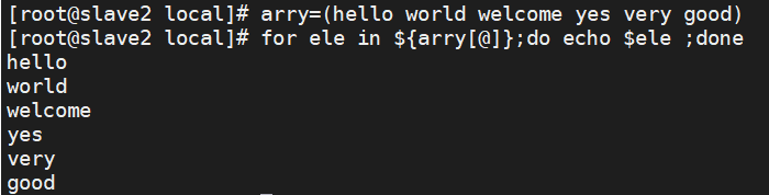 arry=(hello world welcome yes very good) for ele in ${arry[@]};do echo $ele ;done