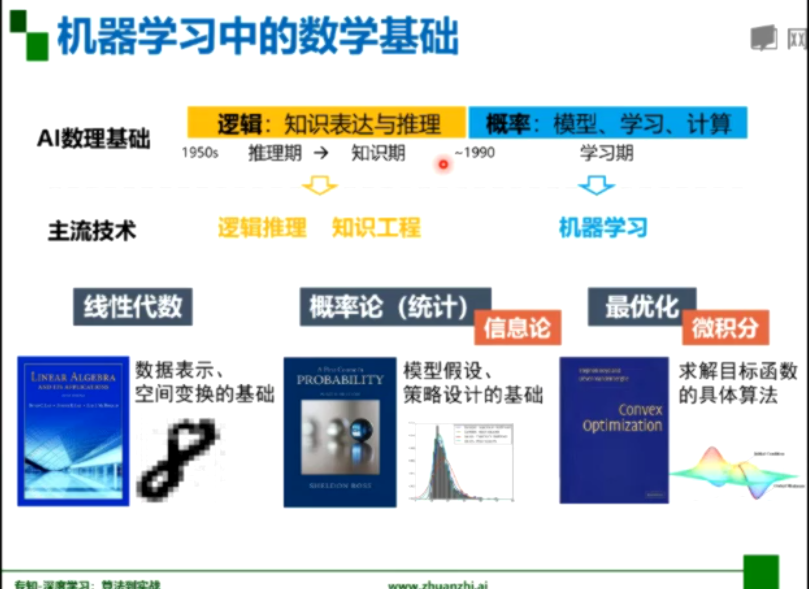 线性代数:对数据/样本通过向量或矩阵的方式去表示;如感知器的一些线性变换,一些操作是在矩阵的相乘上进行的。