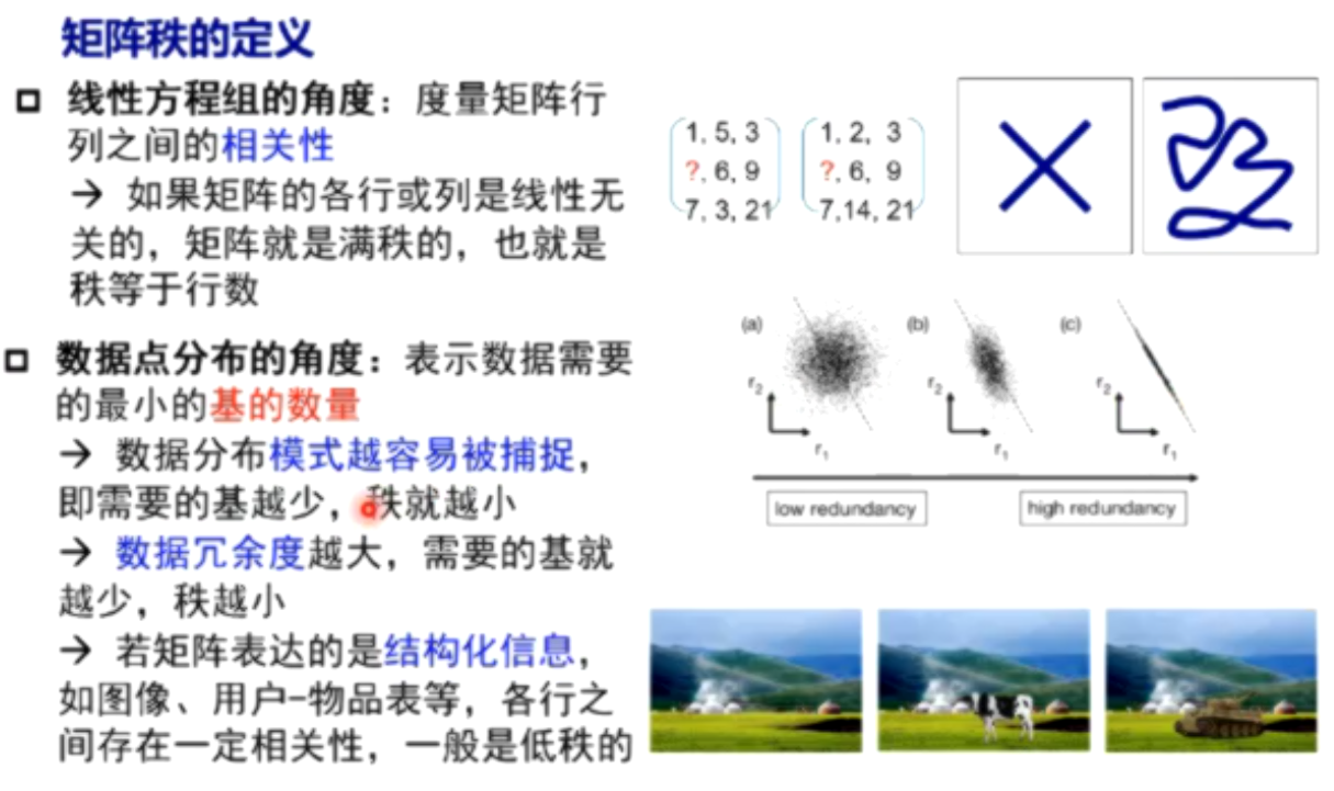 3、桑老师将矩阵的秩,理解为秩序,越有秩序,秩越小,需要的基越小,数据分布的模式就越容易被捕捉。