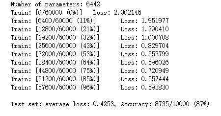 # Training settings n_features = 6 # number of feature maps model_cnn = CNN(input_size, n_features, output_size) model_cnn.to(device) optimizer = optim.SGD(model_cnn.parameters(), lr=0.01, momentum=0.5) print('Number of parameters: {}'.format(get_n_params(model_cnn))) train(model_cnn) test(model_cnn)