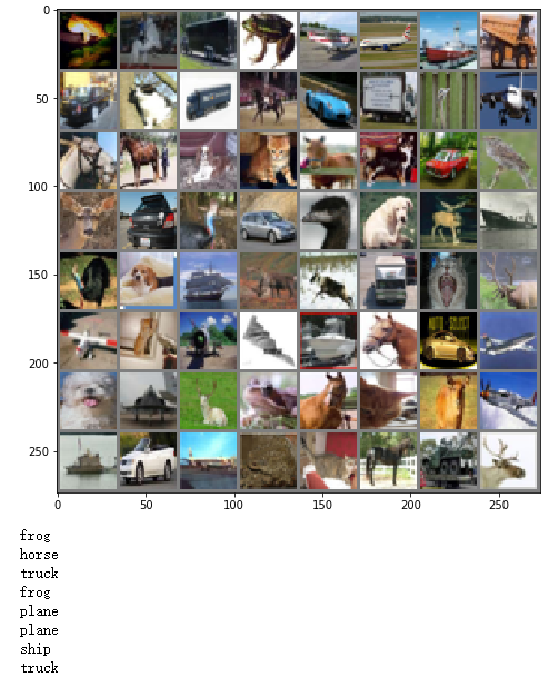 def imshow(img): plt.figure(figsize=(8,8)) img = img / 2 + 0.5 # 转换到 [0,1] 之间 npimg = img.numpy() plt.imshow(np.transpose(npimg, (1, 2, 0))) plt.show() # 得到一组图像 images, labels = iter(trainloader).next() # 展示图像 imshow(torchvision.utils.make_grid(images)) # 展示第一行图像的标签 for j in range(8): print(classes[labels[j]])